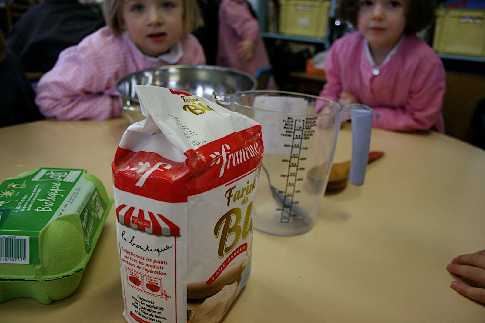 measure flour, place in bowl, and on desk, and on floor, and in hair, and on papa's sweater;