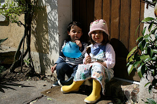 Anyway, I digress. Here's the sun, and the flowers, and the baby leaves, and whatever - this is not my first spring you know; I've seen this before. But then there we were, hanging out with cousins Melina and Nefeli and Constantinos taking in a few rays while the lamb edged its way to medium rare, when I see this shiny object under a bush. It kinda looked like one of those space blankets but with a mauve hew. I decided to investigate.